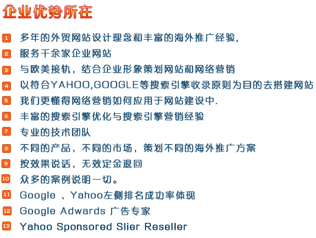 SEO网站建设、200个搜索引擎推广、20大B2B推广,为中国出口企业量身打造高效、低成本的外贸网络营销市场,提供一整套网上出口贸 易策划方案及服务。